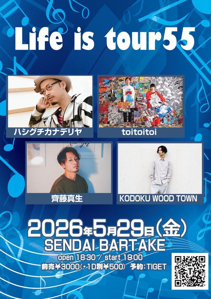 Life is tour 55 SCHEDULE 2026/05/29(金) 仙台BARTAKE OPEN 18:30 / START 19:00 3000円 (別途ドリンク代) 〈出演〉 ハシグチカナデリヤ toitoitoi 齊藤真生 KODOKU WOOD TOWN チケット予約 URLをコピーする 報告する