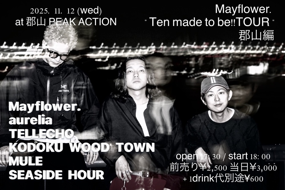 Mayflower. “Ten made to be!!” TOUR 郡山編 SCHEDULE 2025/11/12(水) 郡山PEAK ACTION OPEN 17:30 / START 18:00 前売券2500円 / 当日券3000円 ※別途ドリンク代 〈出演〉 Mayflower aurelia TELLECHO KODOKU WOOD TOWN MULE SEASIDE HOUR チケット予約 URLをコピーする 報告する