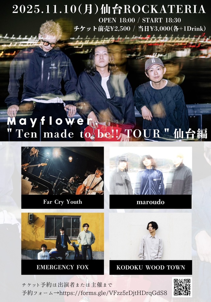 Mayflower. “Ten made to be!! TOUR” 仙台編 SCHEDULE 2025/11/10(月) 仙台ROCKATERIA OPEN 18:00 / START 18:30 前売券2500円 / 当日券3000円 ※別途ドリンク代 〈出演〉 Mayflower Far Cry Youth maraud EMERGENCY FOX KODOKU WOOD TOWN チケット予約 URLをコピーする 報告する