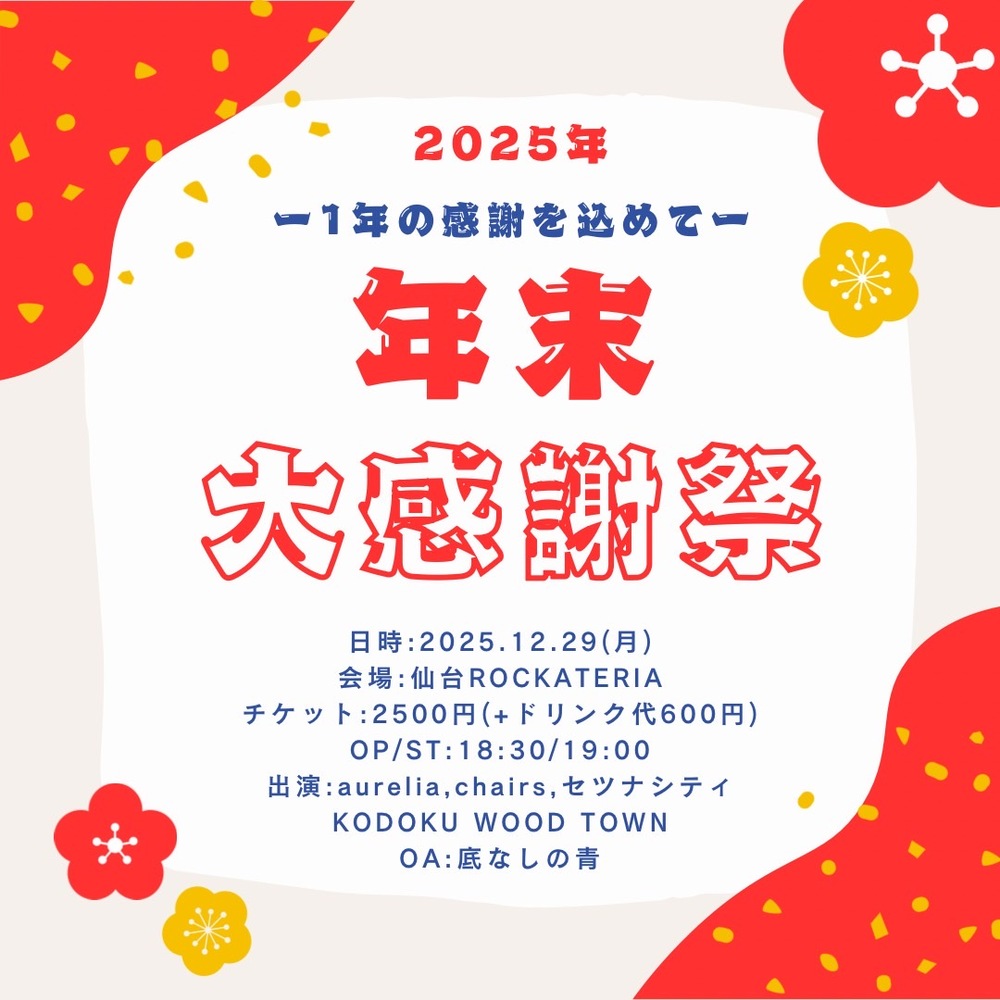 -1年の感謝を込めて- 年末大感謝祭 SCHEDULE 2025/12/29(月) 仙台ROCKATERIA OPEN 18:30 / START 19:00 2500円 (別途ドリンク代) 〈出演〉 aurelia chairs KODOKU WOOD TOWN セツナシティ 【O.A.】底なしの青 URLをコピーする 報告する